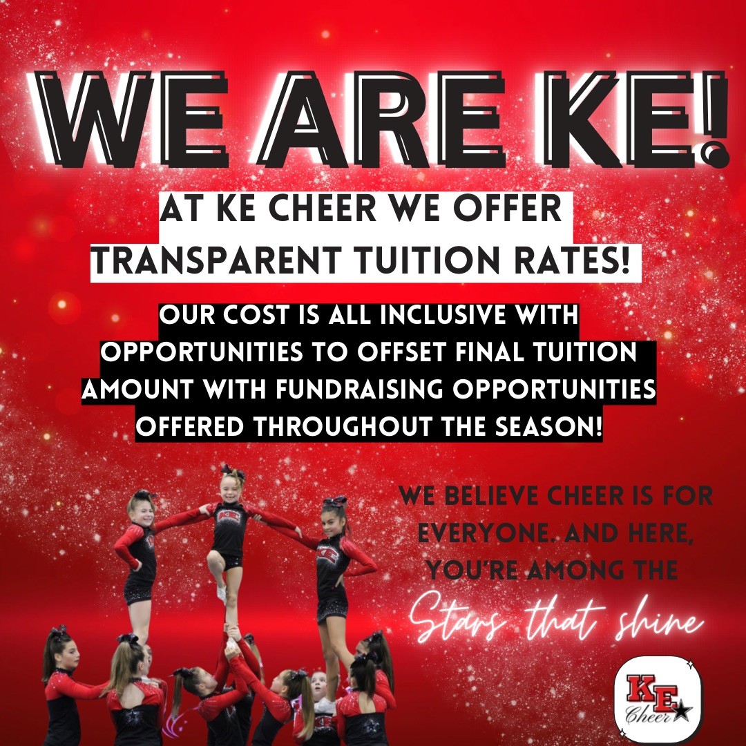 KE Cheer strives to keep our costs as the most affordable performance recreation non-affiliated cheer organization in South Jersey. Our *all-inclusive* cost for Tiny Level 1 – Senior Level 4 is $950 (early registration is $900) & Tiny Expo Level 1* is $550 (early registration is $500) WITH fundraising opportunities that allow families to get money off tuition costs!